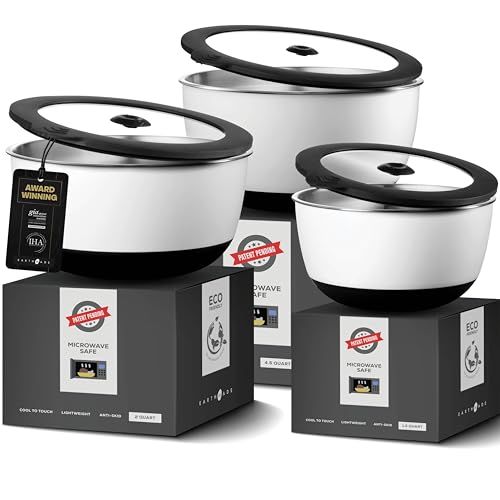 Earthmade’s Evolution Stainless Steel Mixing Bowl Set is microwavable as long as the airtight tempered glass lids are on. The Stainless Steel Bowls are cool to the touch, odor-resistant, and dishwasher and freezer safe. They also have an anti-skid rubber base. The set includes 1.5 quart, 3 quart, and 4.5 quart Bowls.