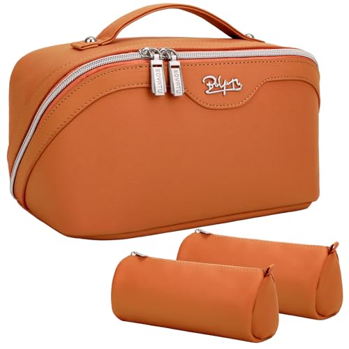 The travel makeup bags set helps you organize your routine in style. With three sizes, wide openings, and structured interiors, these PU leather pouches hold everything from skincare to full glam. The earthy orange-brown shade makes it look way more luxe than it costs.