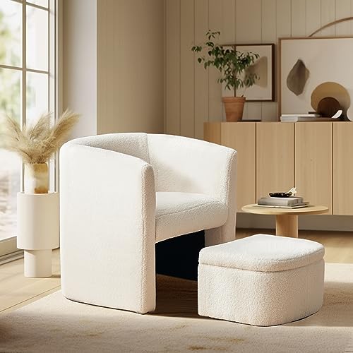 This cozy upholstered armchair works overtime with a storage ottoman that slides right under the seat for an even more compact style when more floor space is needed, or you don’t want to kick your feet up.
