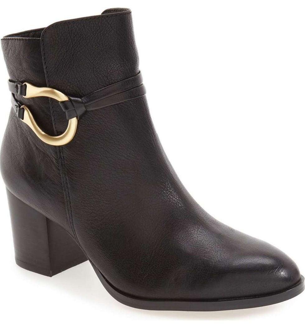 1. Just like every girl needs her little black dress, she also needs her go-to little black booties. The Isola “Odell” Block Heel Bootie ($99) takes the basic leather black bootie and jazzes it up with a gold ring buckle.