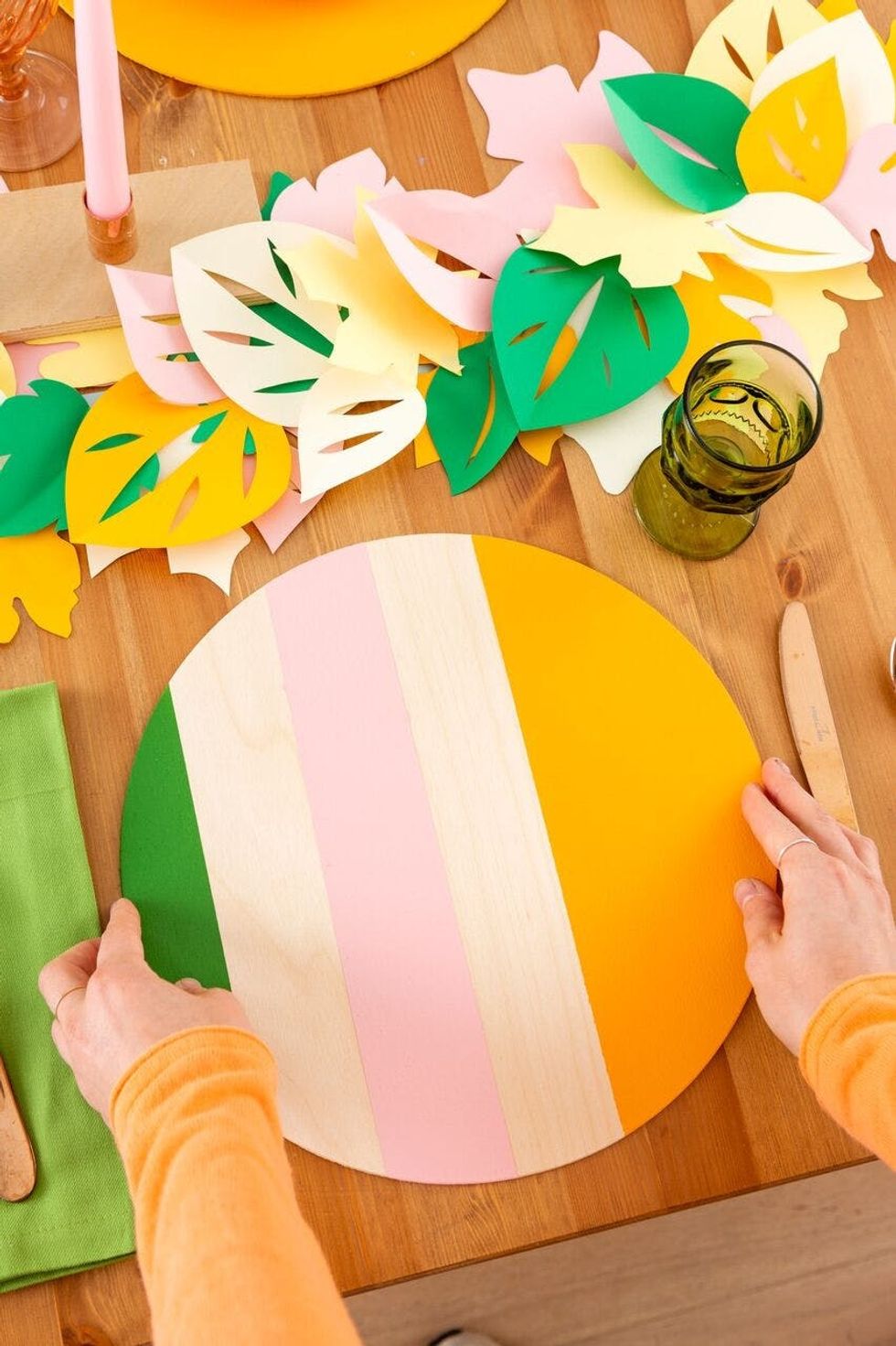 DIY Color Blocked Placemat: Set the tone for an epic meal ahead with a splashy, color blocked charger. Scroll through to see how to DIY it in four simple steps.