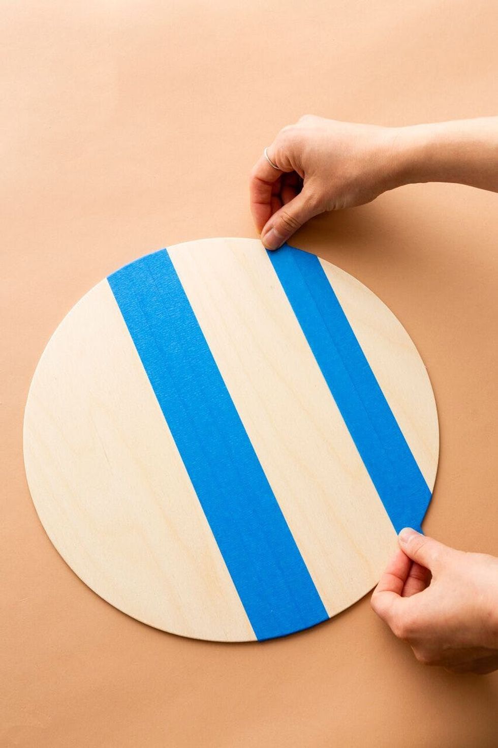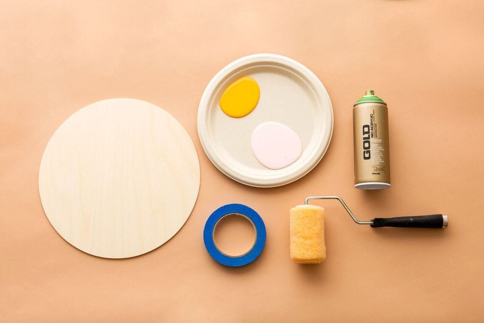 You'll need: 12-inch wood circle cutout, painter's tape, spray paint or paint, and thick paper