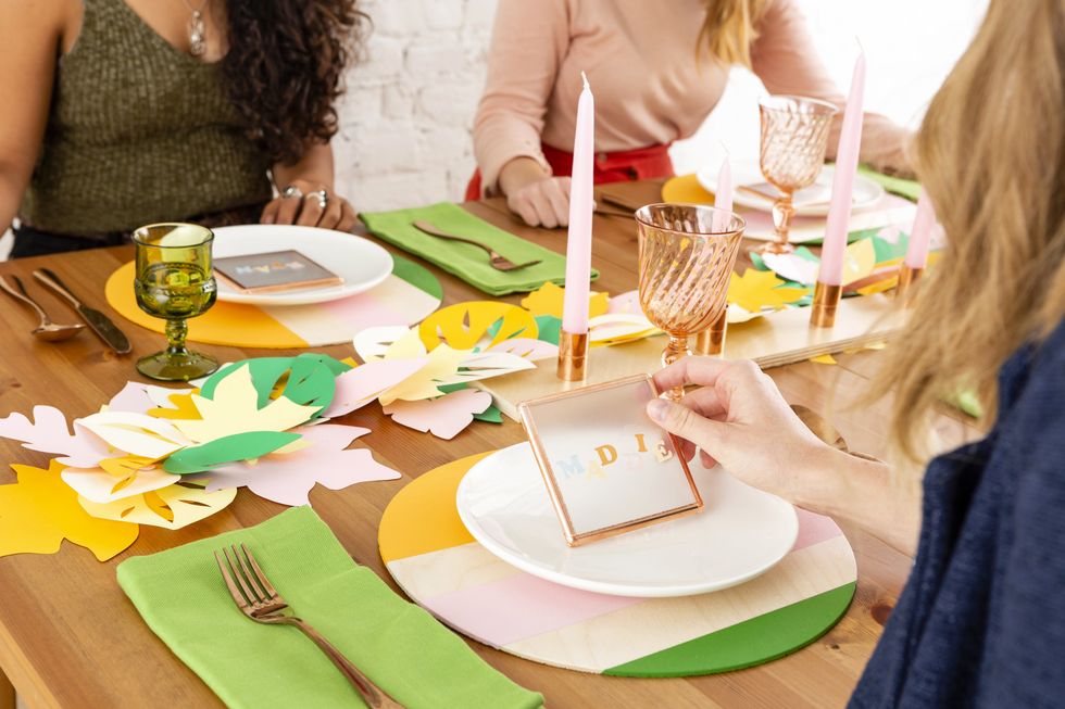 DIY Press Name Card Instructions: Guide your besties to their seats at the party table with a floral coaster DIY that can be hacked into personalized name cards. Swap letters for the flowers and then use mod podge to secure them on a single piece of acrylic. Let them dry and set them out. Bonus: They also make the best party favors!