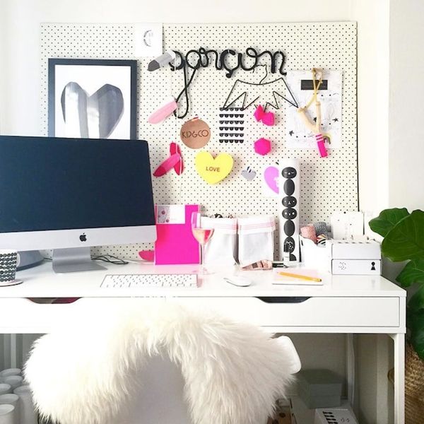 7. Wire Frame Board: If you don’t want to mount a bulletin board, just lean a section of wire frame behind your desk for an easy place to clip images, receipts and maybe even some cup storage for your pens and pencils. (via @marsala_design)