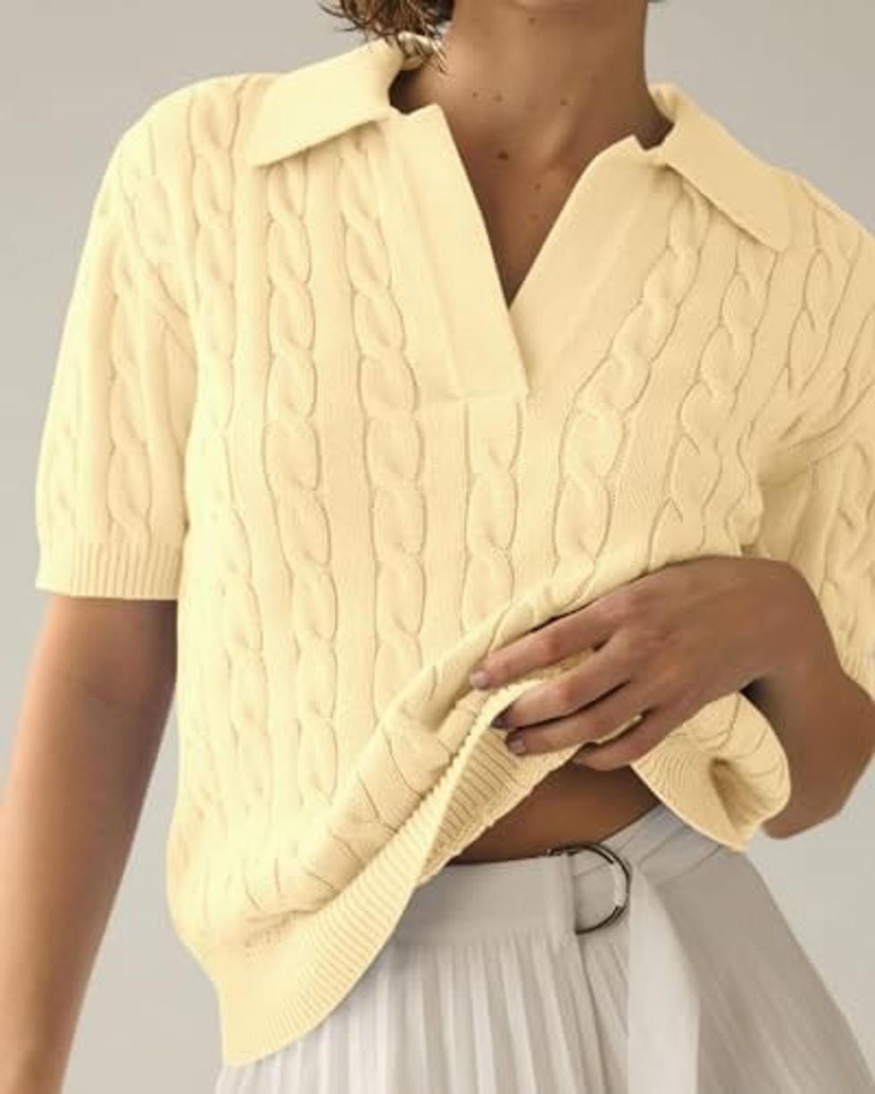 Casual but never plain, this short-sleeve cable knit sweater offers a cozy touch even on breezy summer days. The open knit and soft stretch keep things breathable, while the lapel detail adds a vintage twist. Tuck it into shorts or let it hang loose over a flowy skirt; it works every time.