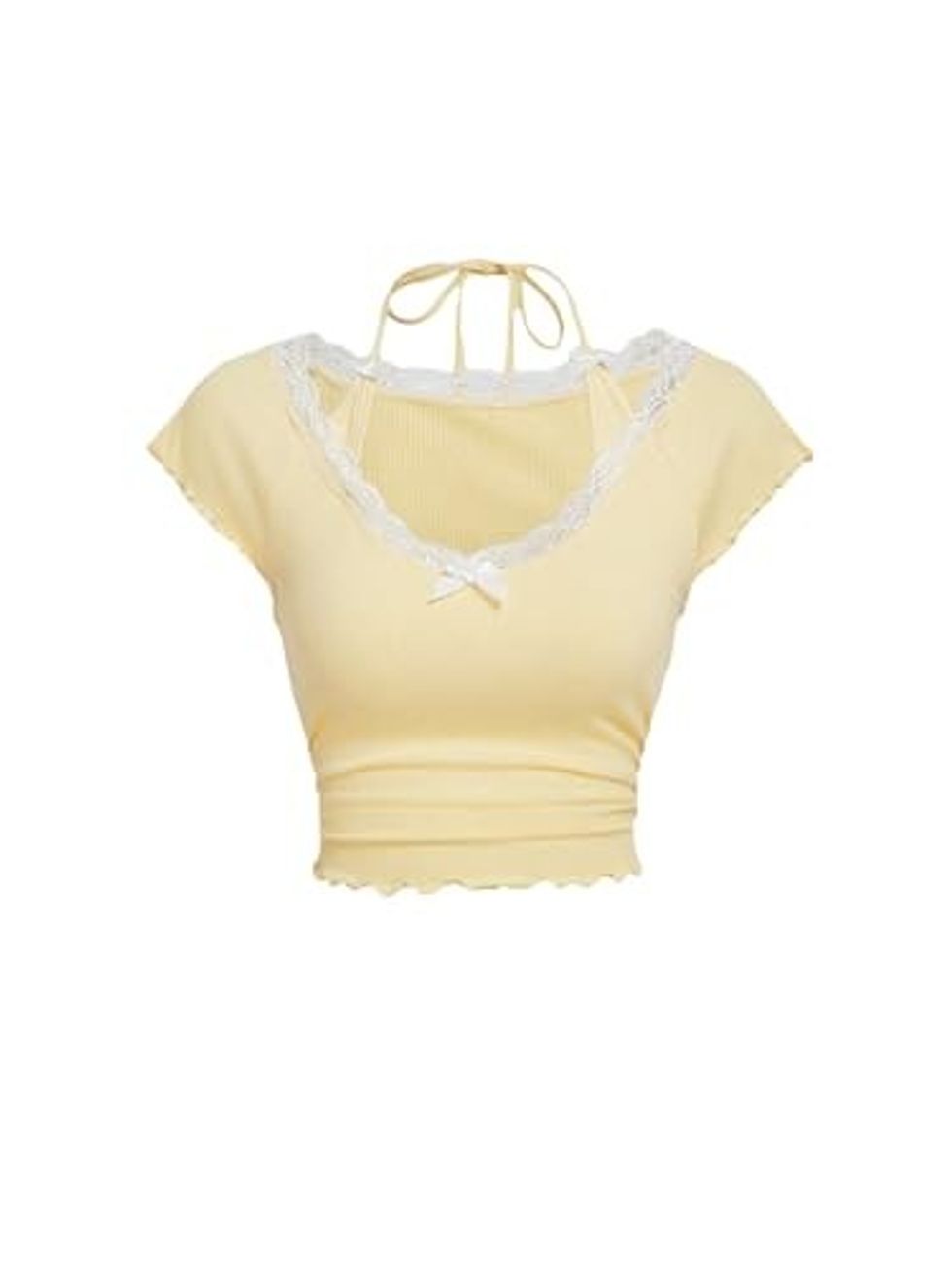 Soft lace and delicate trim come together in this contrast halter crop top that toes the line between Y2K revival and coastal romance. With its tie-back neckline and lettuce edges, it feels sweet and a little nostalgic — perfect for beach towns, bike rides, and every golden-hour hang.
