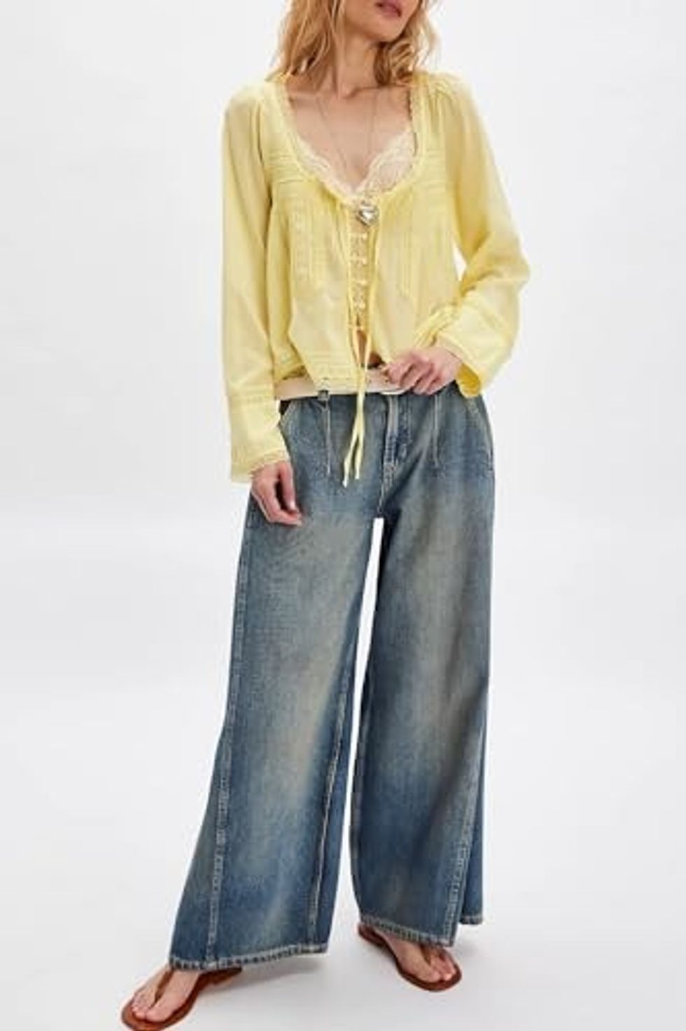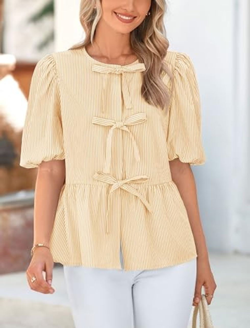 Structured yet floaty, this tie-front striped peplum blouse gives off fresh-from-the-seaside energy. The puffy sleeves and babydoll cut feel playful, while the subtle stripes and soft yellow color keep things elevated. Worn with jeans or flared trousers, it’s equal parts cute and put-together.
