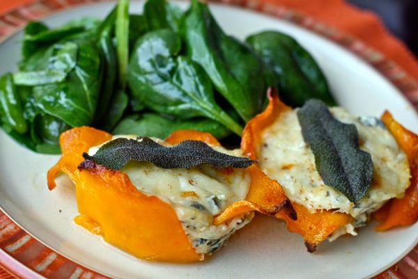 To assemble lasagna cups, spray muffin tin with cooking spray and place 12 of your largest slices in the bottom of each muffin cup. Spoon a layer of the ricotta mixture in each cup, and pour some of the white sauce over the top. Sprinkle with Fontina cheese and repeat layers once more, this time laying the squash piece the other direction. Top with freshly grated Parmesan or Pecorino and bake for 30-35 minutes, or until brown and bubbly.