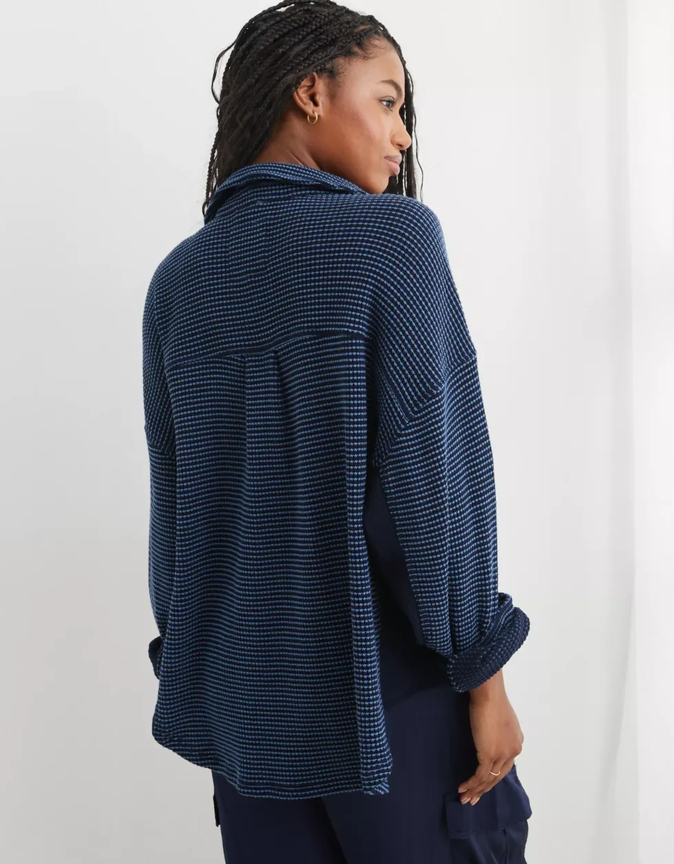 This button-down waffle knit shacket is made from a comfy cotton blend and is available in 5 different colors!