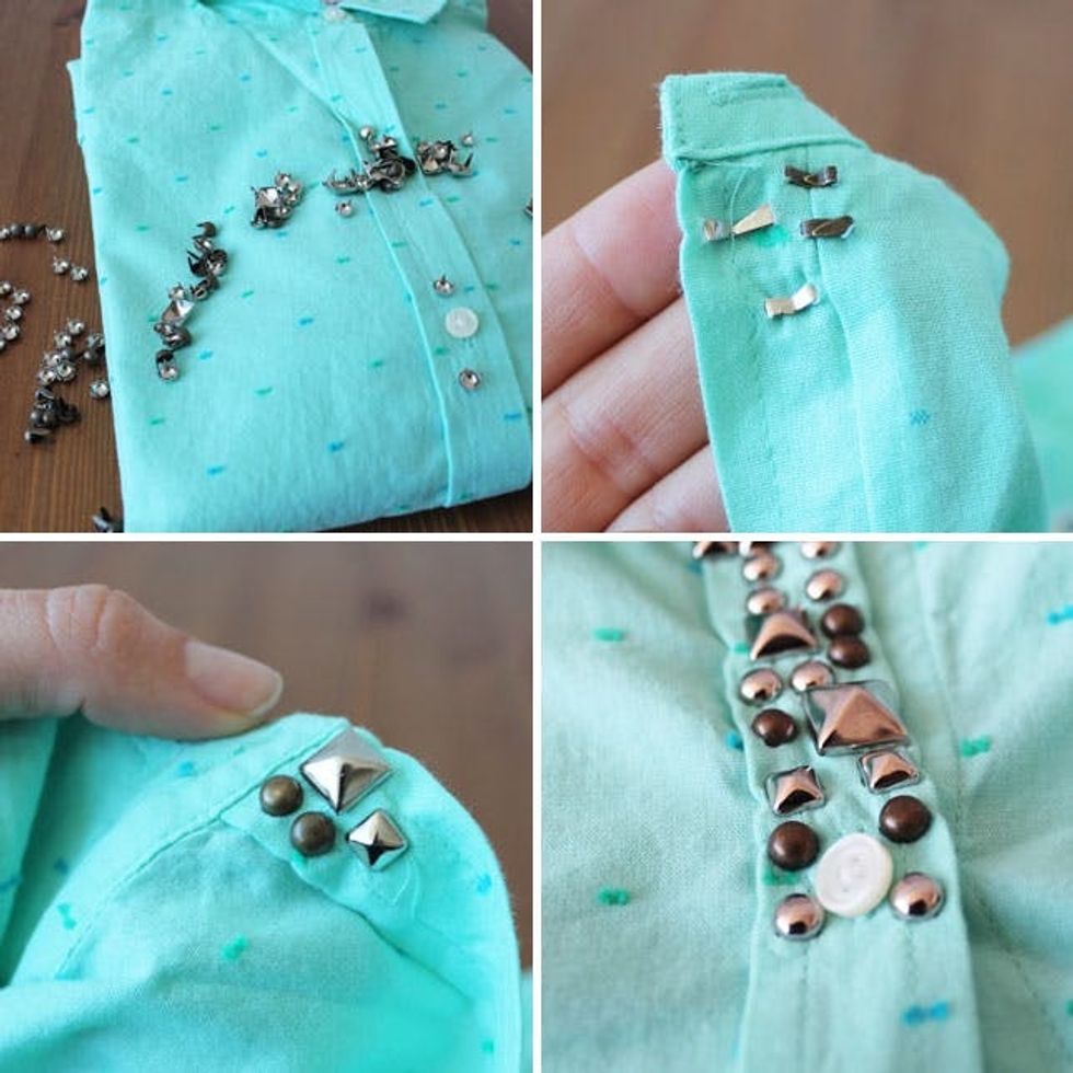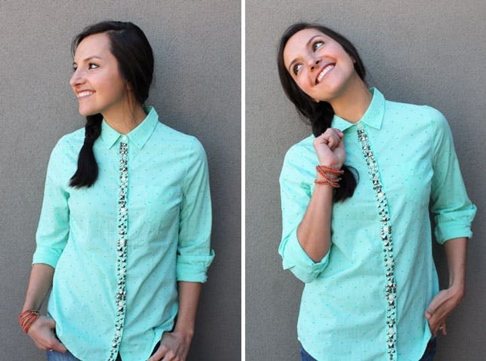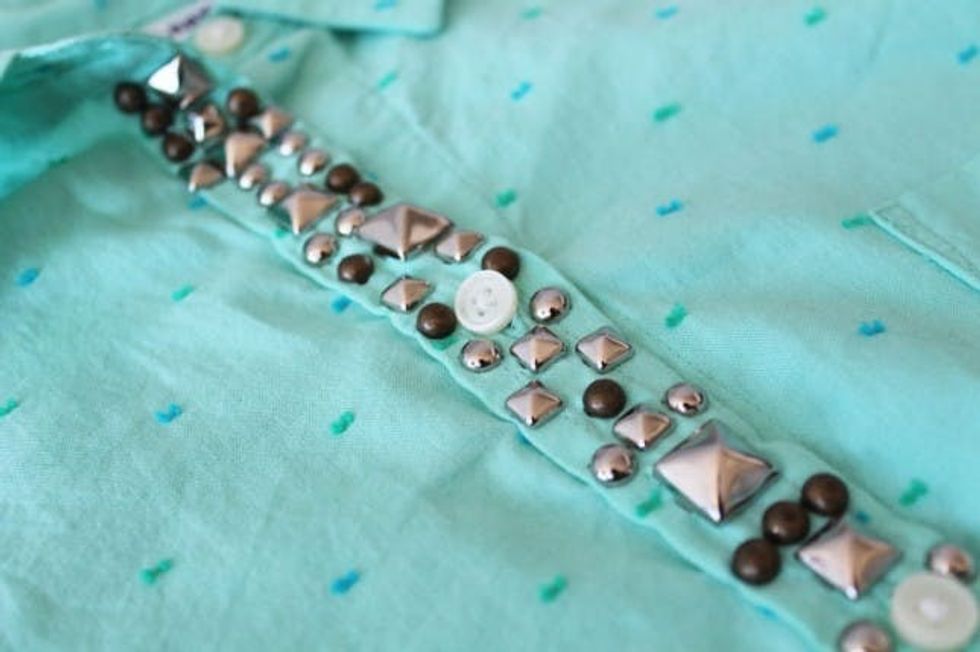 Get a whole bunch of studs and stud the entire button panel of your shirt. This is the part that goes down the middle of the shirt. Be sure to unbutton the shirt before you stud or your shirt won’t unbutton! ;)