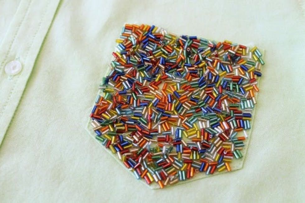 Brush your craft glue onto the pocket of your shirt. Pour beads on and press into the glue. Continue for the whole pocket!