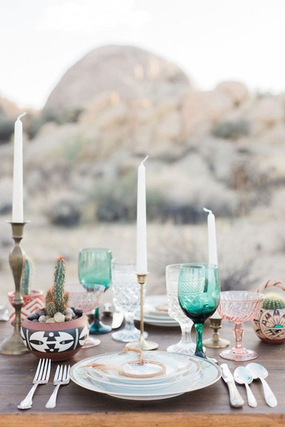7. Understated Elements: Small, subtle cacti with colored glassware and tapered candles is a total *100.* This is a perfect example of bringing in succulents and having them make a statement, but not letting them take over the show. (via Anya Kernes / 100 Layer Cake)