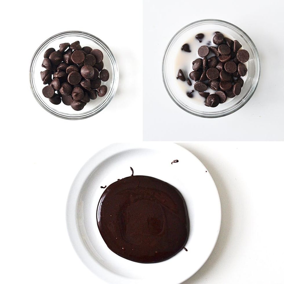 1. Pour the dark chocolate chips and a small amount of milk in a small microwave-safe bowl. Microwave it for about 10-15 seconds or until you start to see the chocolate melting. Stir completely until the mixture is smooth and creamy.