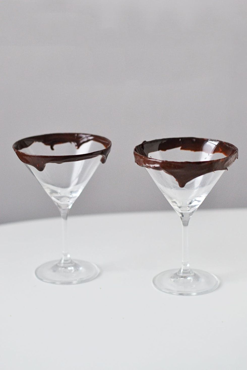 2. Pour the chocolate on top of a level plate and carefully rim the martini. Let gravity do its thing by letting the chocolate drip on the edges of the glass. Place the glasses to the side.