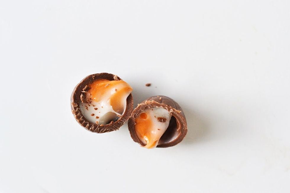 3. For the cocktail, unwrap the Cadbury egg, cut it down the middle, and carefully scoop out the cream. Shake the cream into the shaker.