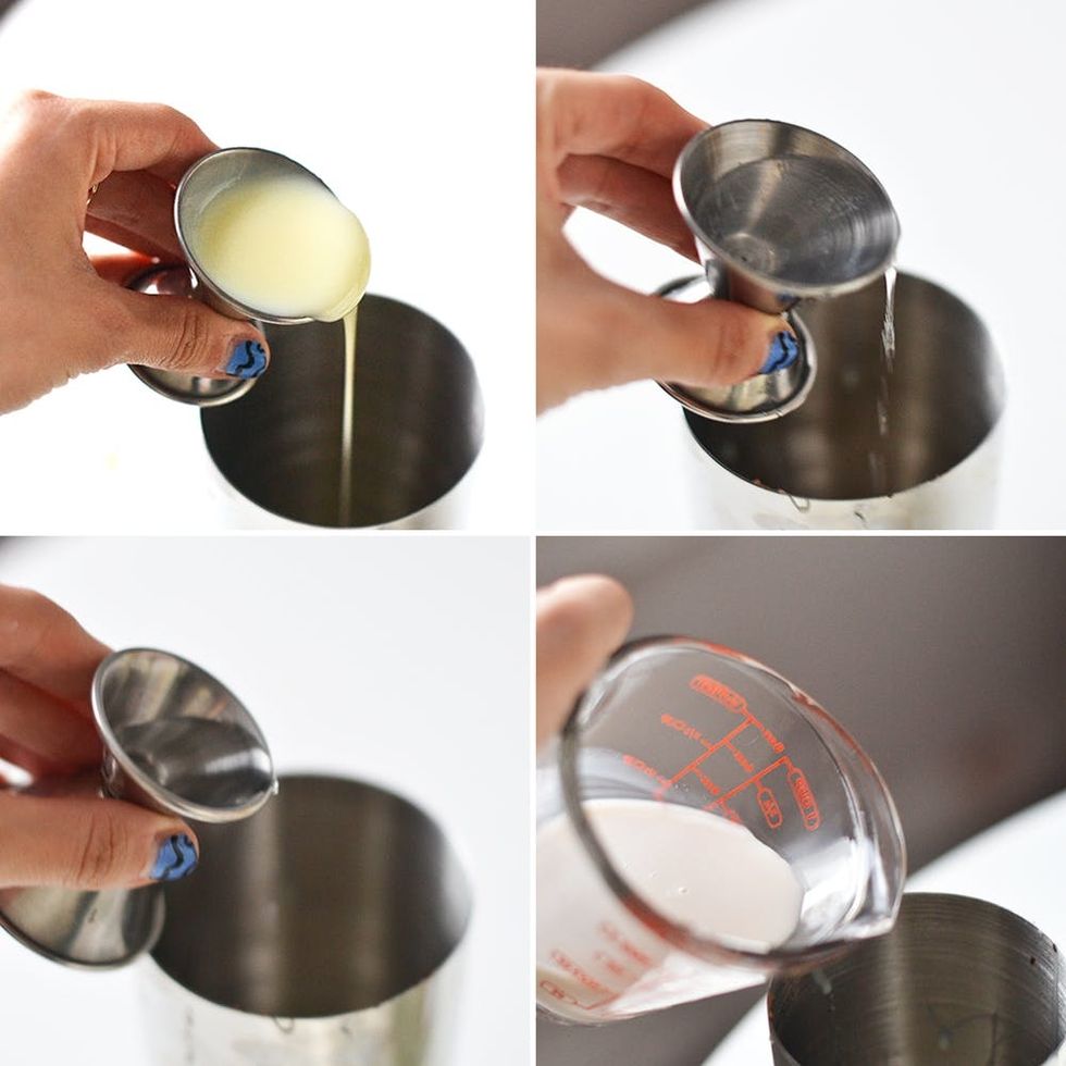 4. Next, measure 1 1/2 ounces sweetened condensed milk, 1/2 ounce of cream de cocoa, 1 ounce vanilla vodka, and 1/4 cup of milk, and place all the ingredients into the shaker. Just double these measurements if you want to create a drink for a friend. (Duh, of course you do.)