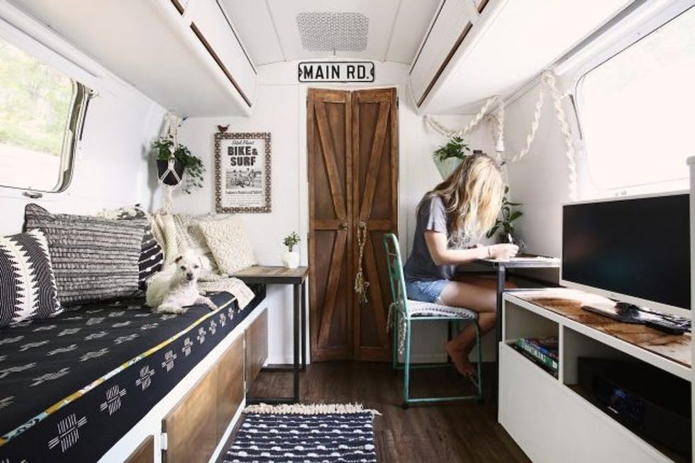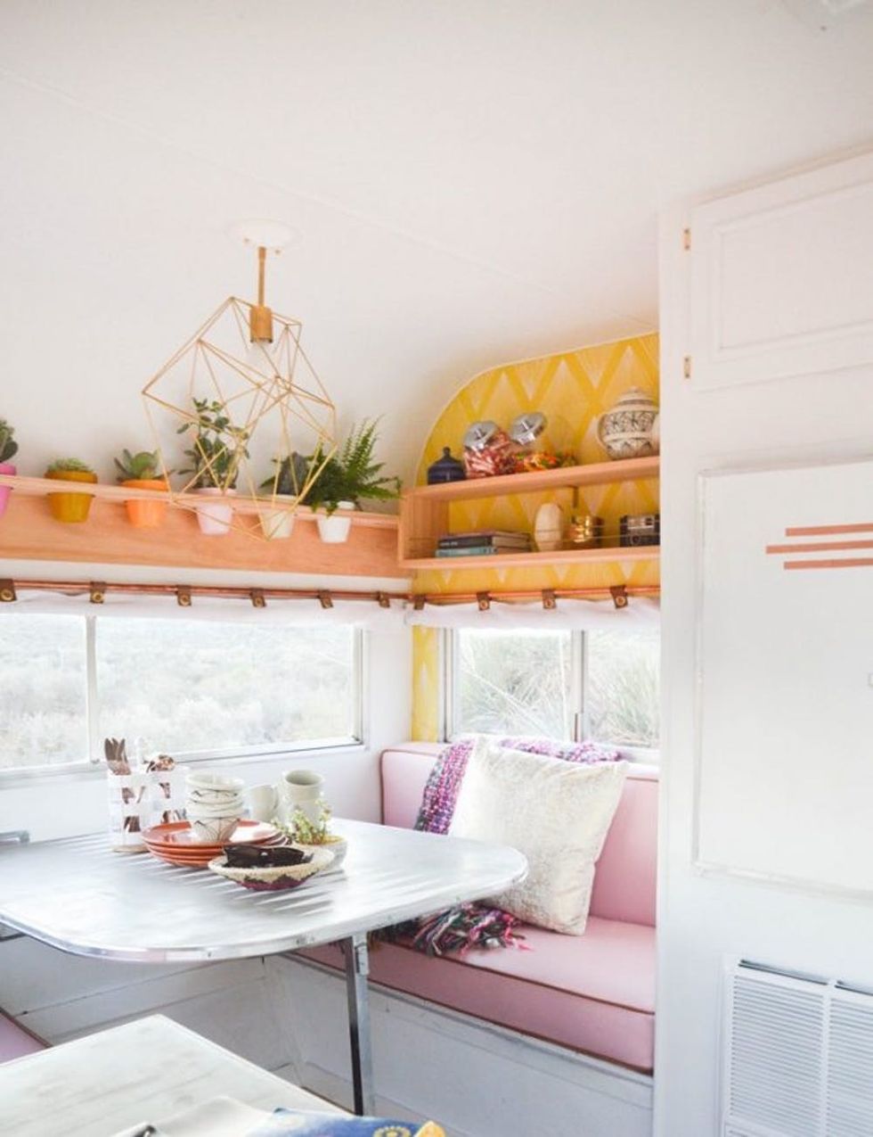 2. Light and Bright Camper: This little darling has everything you need for a staycation weekend or weeklong camping trip in the woods. It’s decked out with just about everything you could need, including a coffee maker, boho hanging planters, and a cushy bench that’s begging for a gathering of friends. (via Zevy Joy)