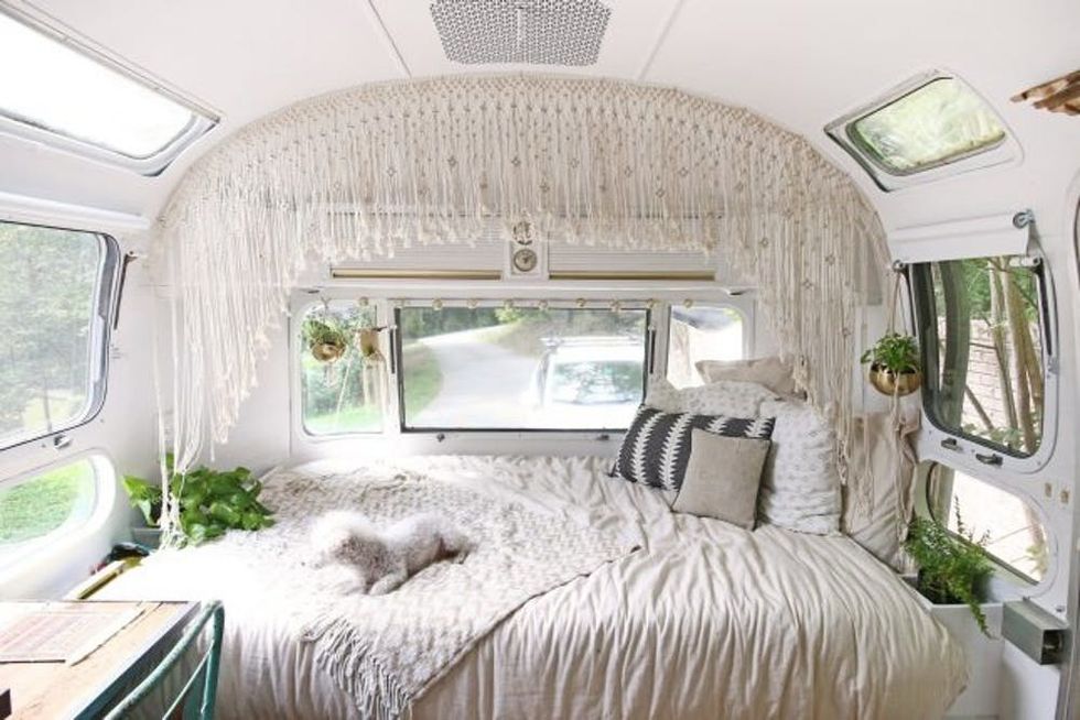 11. Macrame Dreams: Bring on those boho vibes with a macrame curtain and a hefty pile of throw pillows. (via Mavis the Airstream)