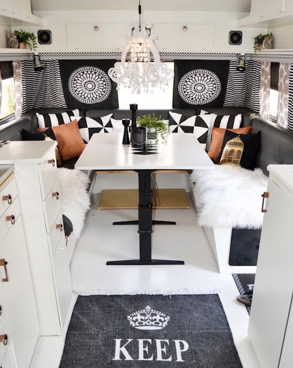 7. Earthy Color Palette: White makes a tiny space feel bigger. And while a minimal palette keeps the trailer from feeling cramped, it’s those warm wooden accents and woven textures that make the space feel cozy and not sterile.