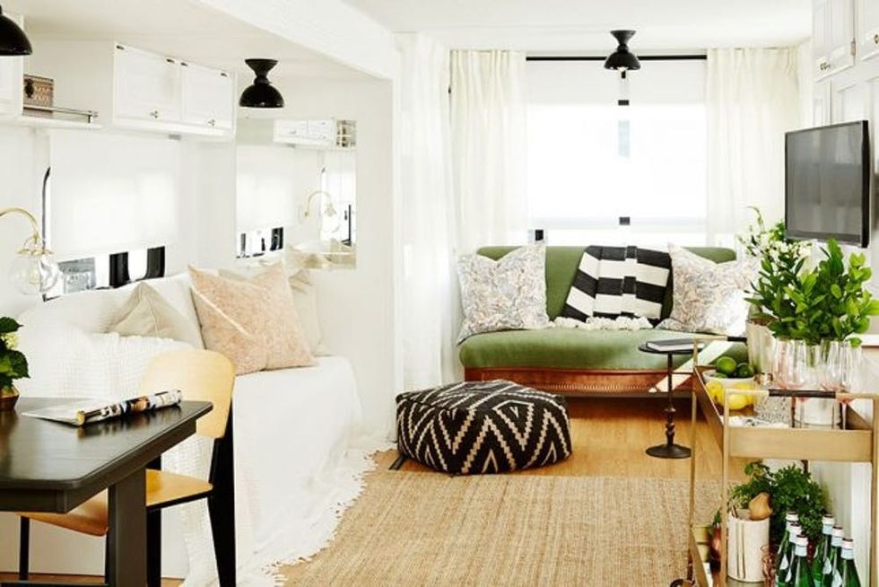 9. Gorgeous Minimalism: Swoon! This trailer is rocking a kitchen bigger than some apartments, and the white cabinets and walls make the galley feel even larger. Luxe touches like the wallpaper on the far wall and gold hardware totally seal the deal.