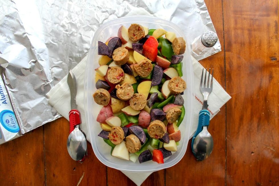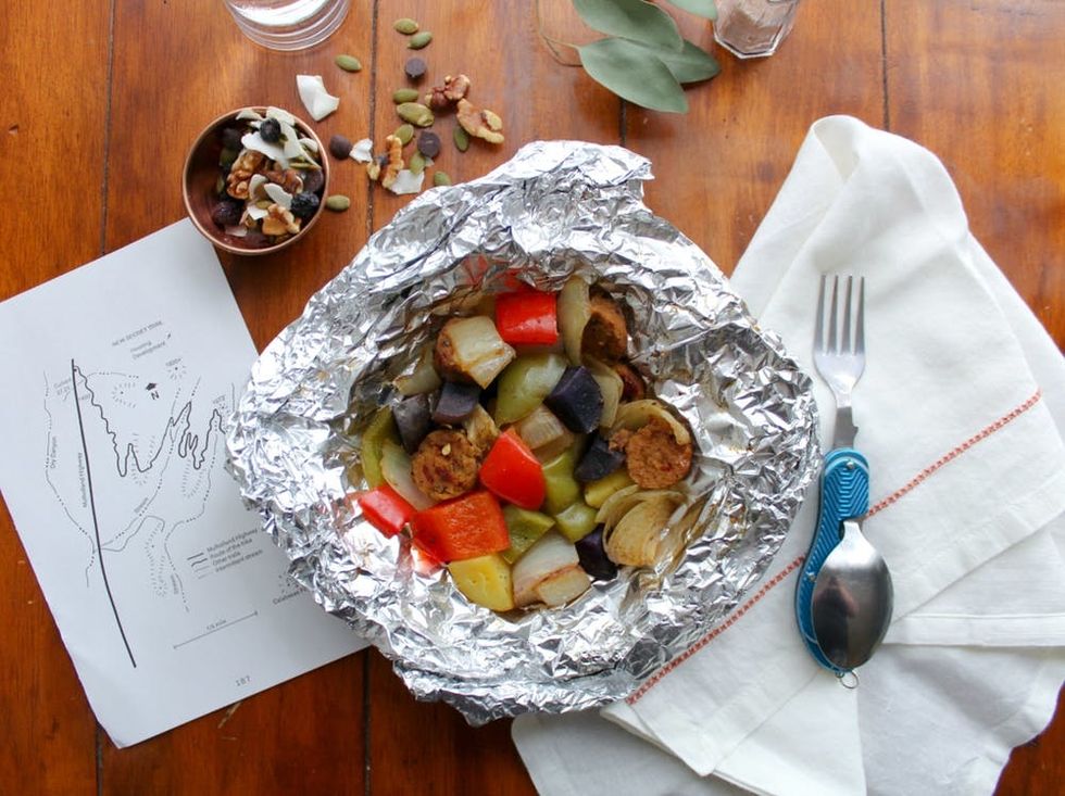 Cooking over a campfire can be a little intimidating unless you have this recipe for veggie packets that turn out well every time. You can prepare your ingredients at home, or you can bring everything and assemble it on the site. Make it your own and swap out the vegan sausages for your favorite smoked sausage (think kielbasa, Portuguese linguica, or even plain old hot dogs) and add your favorite marinades and seasonings. Even if you’re not experienced with campsite cooking, this is one method you’ll be able to master.