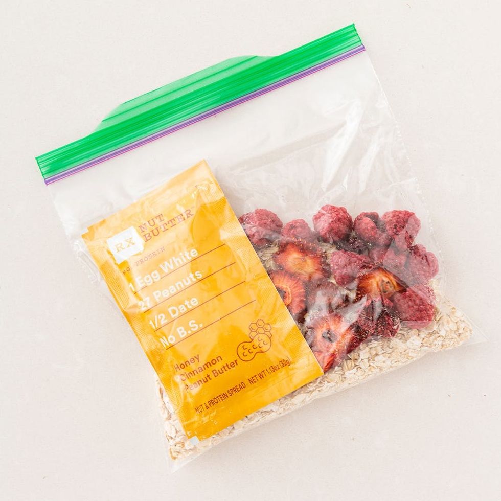 One of the most filling and easiest breakfasts for the trail is this fruit-PB oatmeal that requires only a few ingredients. Though you technically can dehydrate steel-cut oats, we have our lazy AF moments too and went for instant oatmeal for convenience. We chose RX PB because it’s flavorful and high-protein with the addition of the egg white. If you dislike the mushy texture of oatmeal, McCallister recommends topping it with a little bit of crunchy granola to liven things up. He also suggests separating the fruit into a small baggie so any additional moisture does not migrate to the oats (oops, we didn’t do this, as pictured).