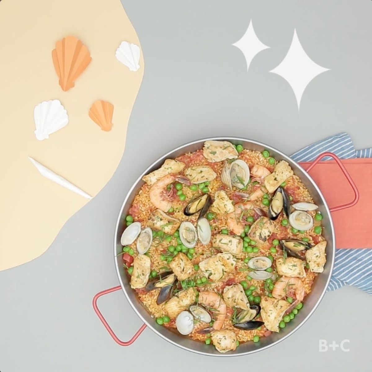 Add sautéd chicken, peas, shrimp, mussels, and clams on top of rice. Cover and steam for 5-6 minutes.