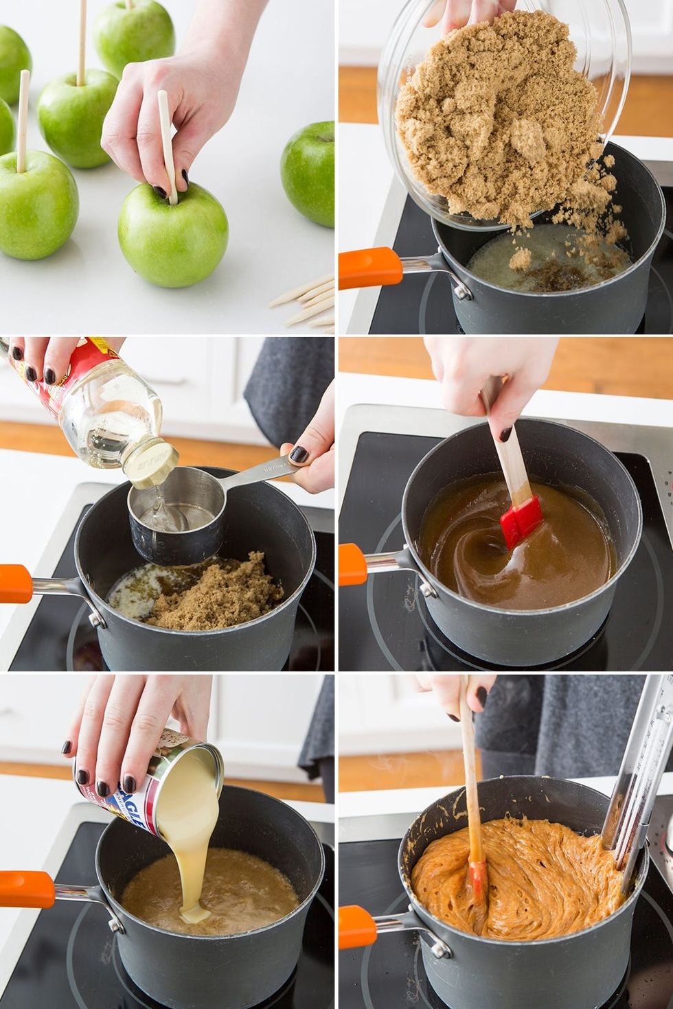 1. Push a candy apple stick or popsicle stick into each apple. Set aside. In a large saucepan, melt butter. Add the brown sugar and corn syrup. Cook over medium heat until mixture comes to a boil, 10-15 minutes. Stir in condensed milk. Cook caramel until a candy thermometer reads 250 degrees F. Stir in vanilla. Remove from heat.