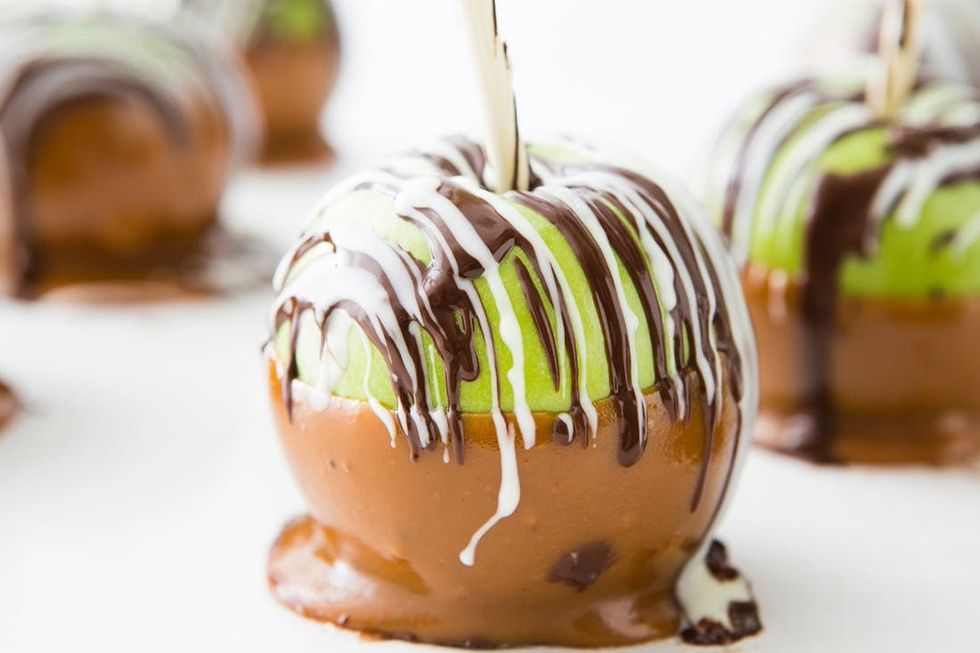 4. Using a spoon, drizzle the melted semisweet chocolate and white chocolate over the caramel apples. Enjoy!