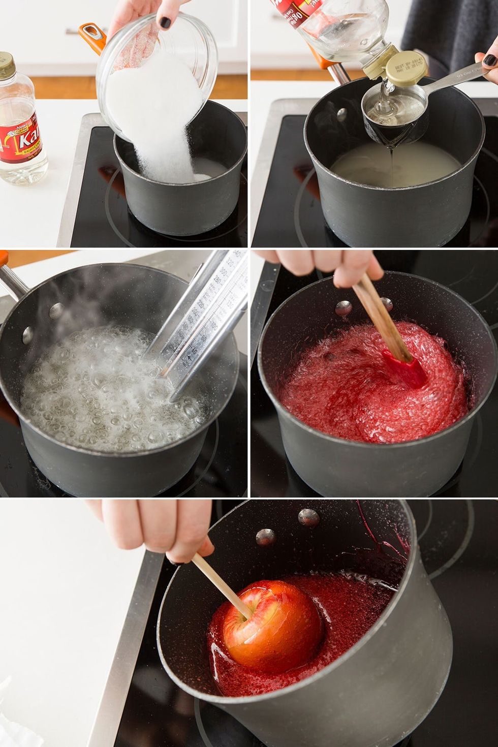 1. Push a candy apple stick or popsicle stick into each apple. Set aside. In a large saucepan, combine the sugar, corn syrup and water. Cook over medium heat until mixture comes to a boil, 20-30 minutes. Continue to cook until a candy thermometer reaches 300 degrees F. Stir in red food coloring. Remove from heat.