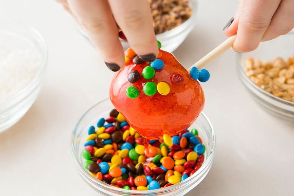 2. Working quickly, dip your apples in the candy mixture and immediately roll in desired toppings.