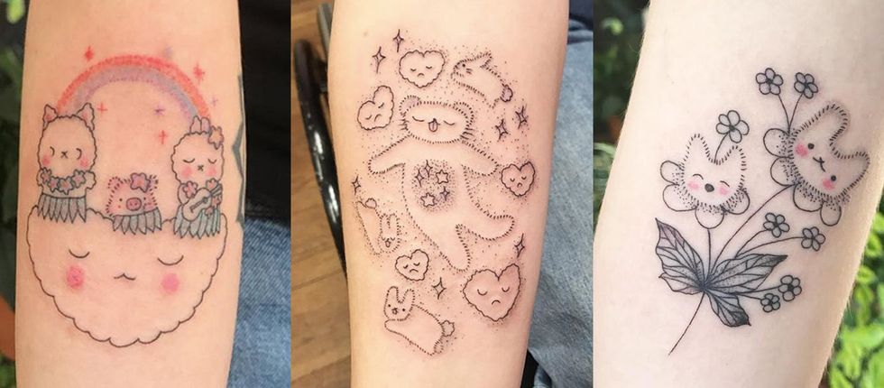 Emily Parworth's anime-inspired tattoo style is whimsical, spooky, and precious all at once. The North Carolina-based artist brings pink-cheeked cartoons to life with delicate line work and intricate scenery on her addictive Instagram feed. "I feel that I've been exposed to the world of cute things for so long that it's a part of my identity," she says.