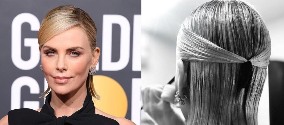 The Tully actress coupled sleek strands with a simple black statement accessory at the 2019 Golden Globes but one question remained: Was it a cuff, or perhaps a coiled hair tie? Celebrity hairstylist Adir Abergel, the mastermind behind Theron’s mane, explained that it’s actually neither. “When I saw the color blocking in the dress, I wanted to create complimentary contrast in the hair with the half up style,” he said. He did so by tightly bounding her hair with a cotton black thread and needle purchased from JOANN Fabric and Craft. (Photo via Steve Granitz/ Getty; Adir Abergel)