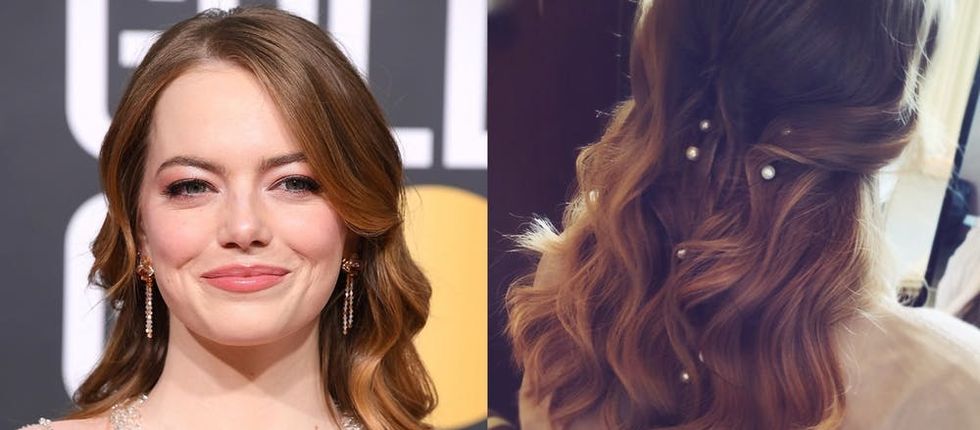 For the Golden Globes, The Favourite actress rocked a red carpet hairstyle that looked fresh out of a fairytale by celebrity stylist Mara Roszak. “To go with Emma’s gorgeous custom Louis Vuitton gown, I created ethereal waves for a softness that complements the dress,” Roszak explains. To add the final touch, Roszak wove an Erica Elizabeth Freshwater Pearl Hair Chain ($330) throughout Stone’s hair, though she notes it can be done on a budget. “You can even weave a string of pearls loosely through the back of the hair for a whimsical detail,” she suggests. (Photo via Steve Granitz/Getty; Mara Roszak)