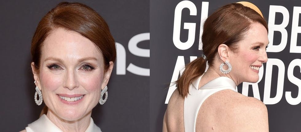 Julianne Moore attended the Golden Globes red carpet in a white Givenchy gown complete with an understated side-parted ponytail wrapped in thread. “Julianne and I felt that wearing her hair up would really show off [her gown] beautifully,” celebrity stylist Marcus Francis offers. “Choosing a ponytail for the Golden Globes felt like it would be glamorous while still feeling effortless and cool.” To capitalize on the laidback-meets-luxe vibe, Francis wrapped a silver thread around the ponytail elastic for a touch of shine. (Photo via Gregg DeGuire; David Crotty/ Getty)