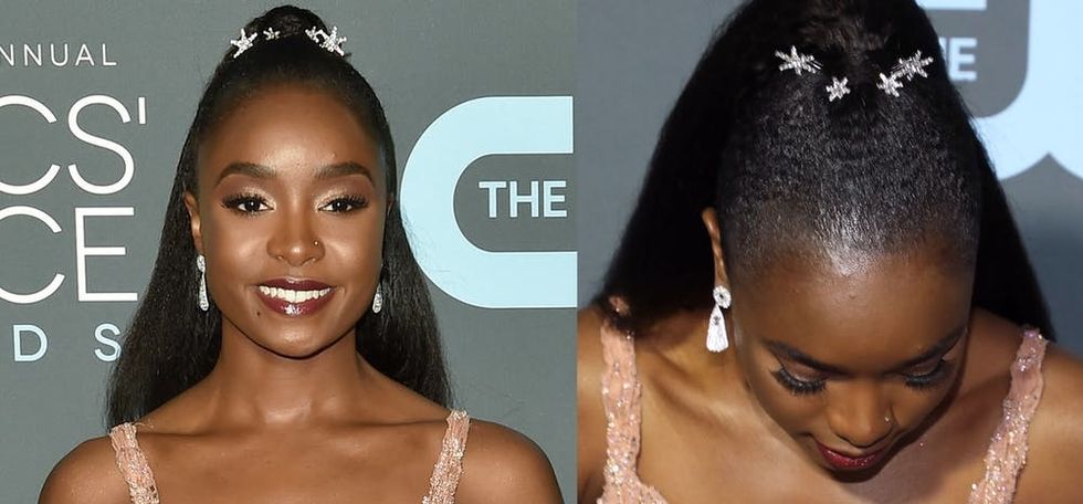 If Beale Street Could Talk, it’d tell Kiki Layne how stunning she looked on the 2019 Critics’ Choice Awards red carpet. The 27-year-old wowed spectators and fellow cast members in a blush beaded Atelier Versace gown topped off with a star-studded hairstyle. “I wanted to give a modern spin to a classic half up half down hairstyle,” celebrity stylist Lacy Redway wrote in an Instagram caption. She used Jennifer Behr Orion Bobby Pins ($142), but instead of inserting them horizontally as they’re designed, she took a vertical approach. “This gave the stars the illusion they were floating above the ponytail,” she added. (Photo via Axelle/Bauer-Griffin; Taylor Hill/ Getty)