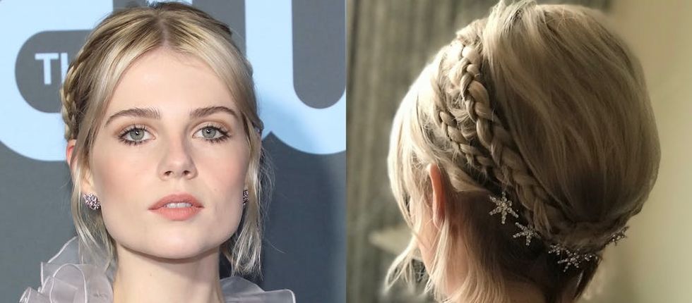 The Bohemian Rhapsody actress attended the Critics’ Choice Awards with a double-sided back braid and creatively placed hairpins. “Lucy’s Gucci dress was so whimsical, [we] had room for the hair to be playful,” celebrity stylist Jenny Cho says. To help secure the braids, Cho used an elastic headband that she wove the braids through for added hold. Once the braids were firmly in place, she placed star pins from the Jennifer Behr Vespera Bobby Pin Set ($258) along the back around the nape for added flare. (Photo via Taylor Hill/ Getty; Jenny Cho)