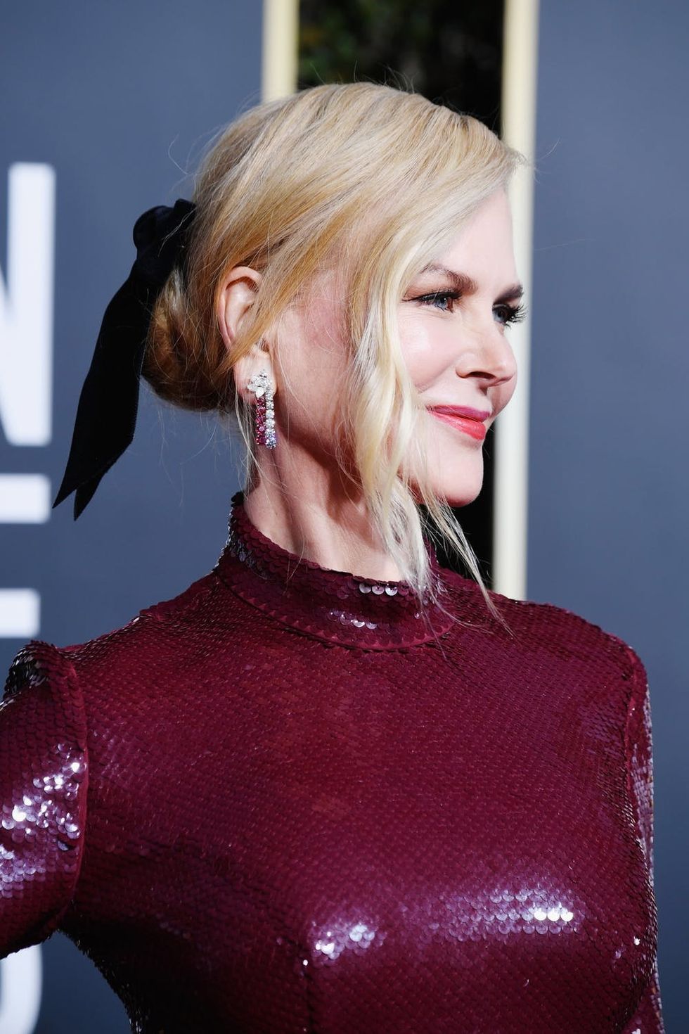 The Destroyer Best Actress in a Drama Motion Picture nominee walked the 2019 Golden Globes red carpet wearing a black velvet bow in her hair. “It was Nicole’s stylist Julia [von Boehm]’s idea, and I loved it,” celebrity hairstylist Kylee Heath says. “We wanted to have the hair up, but with a detail to tie in the black shoes.” To bring the idea to life, Heath began by blowdrying Kidman’s hair. She then sectioned the front out and pulled the rest into a low ponytail, which she curled and pinned into a low bun. She curled the free-flowing front section as well, though, to make it more ethereal, she brushed it out and applied a touch of the TRESemmé Keratin Smooth Shine Serum ($5) for added shine. Heath completed the look by clipping a Jennifer Behr Black Wide Velvet Bow Barrette ($152) above the bun and finishing with the TRESemmé TRES Two Unscented Extra Hold Hair Spray ($5). (Photo via Frazer Harrison/ Getty)