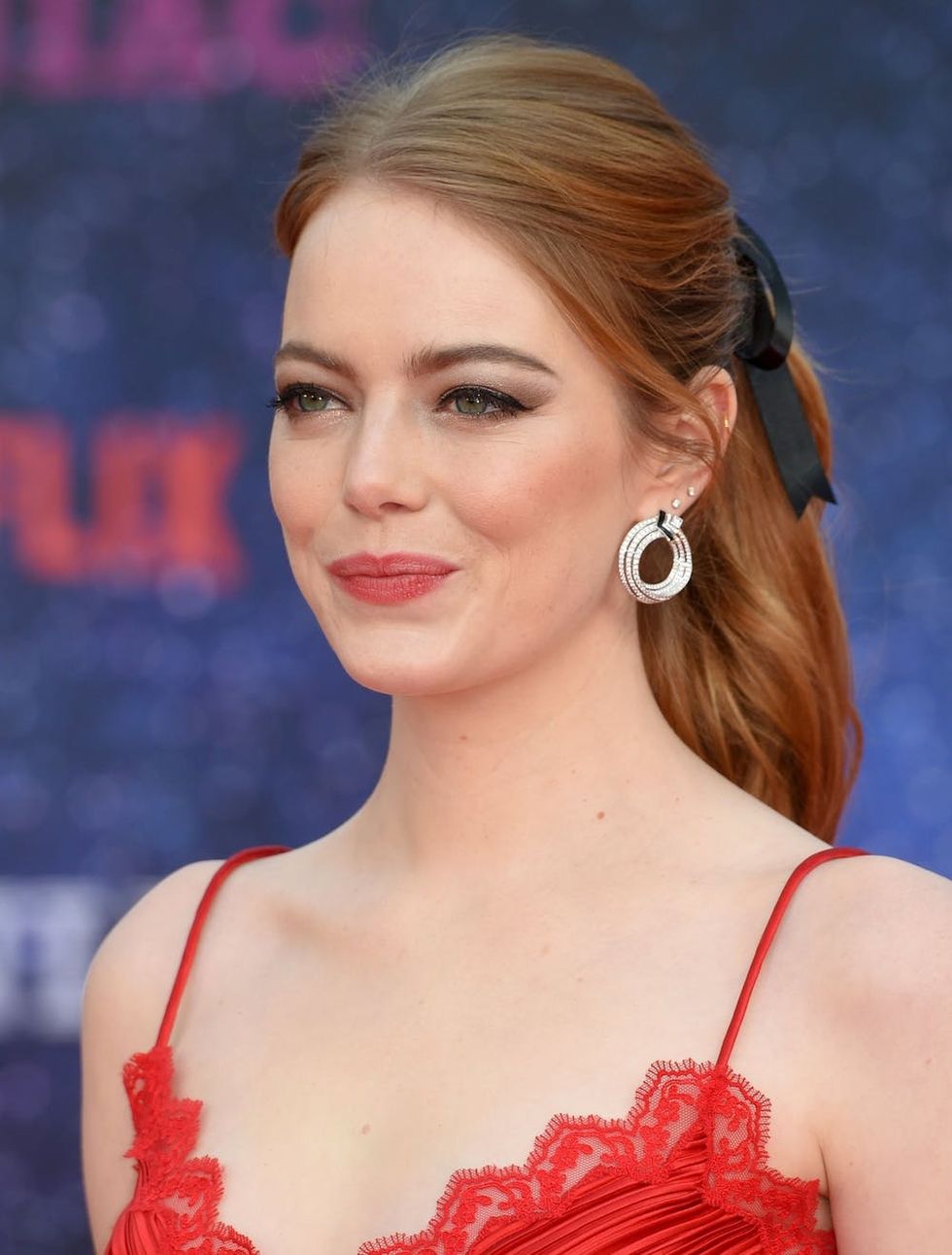 Who doesn’t love a schoolgirl updo? “A pony is always cool, never too formal, and it absolutely complements any outfit,” celebrity hairstylist Mara Roszak says. “For the London premiere of Maniac, I created this full ponytail with a bit of a soft wave and a bow for Emma.” While the end look is relatively simple, it took quite a few steps to bring it to life. First, Roszak blowdried Stone’s locks in Velcro rollers, using PHYTO Phytovolume Actif Volumizer Spray ($30) at the root. After letting them sit for five minutes, she uncoiled them and curled her hair with a 1.5-inch curling iron for a loose bend. “I teased the hair a bit at the crown for added height (most textured pony tails can use it), then I pulled all the hair back into a mid-height pony tail, securing it with a strong elastic,” she says, noting to make sure that the hair tie is tight enough that it won’t budge. To perfect the pony, Roszak gently loosened a few face-framing tendrils for added softness and used a ribbon from the fabric store to tie it all together. “Before she went out onto the red carpet I sprayed Davines This Is A Shimmering Mist ($22) all over and brushed through the pony gently,” Roszak says. “Then I set it all with Leonor Greyl Voluforme Styling Spray ($36).” (Photo via ANTHONY HARVEY/ Getty)