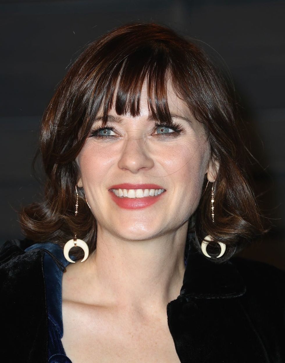 7. Asymmetrical Bangs: Balance out an elegant hairstyle like a curled bob with askew bangs. The uneven lengths add dimension to Zooey Deschanel’s otherwise timeless look. (Photo via Frederick M. Brown/Getty)