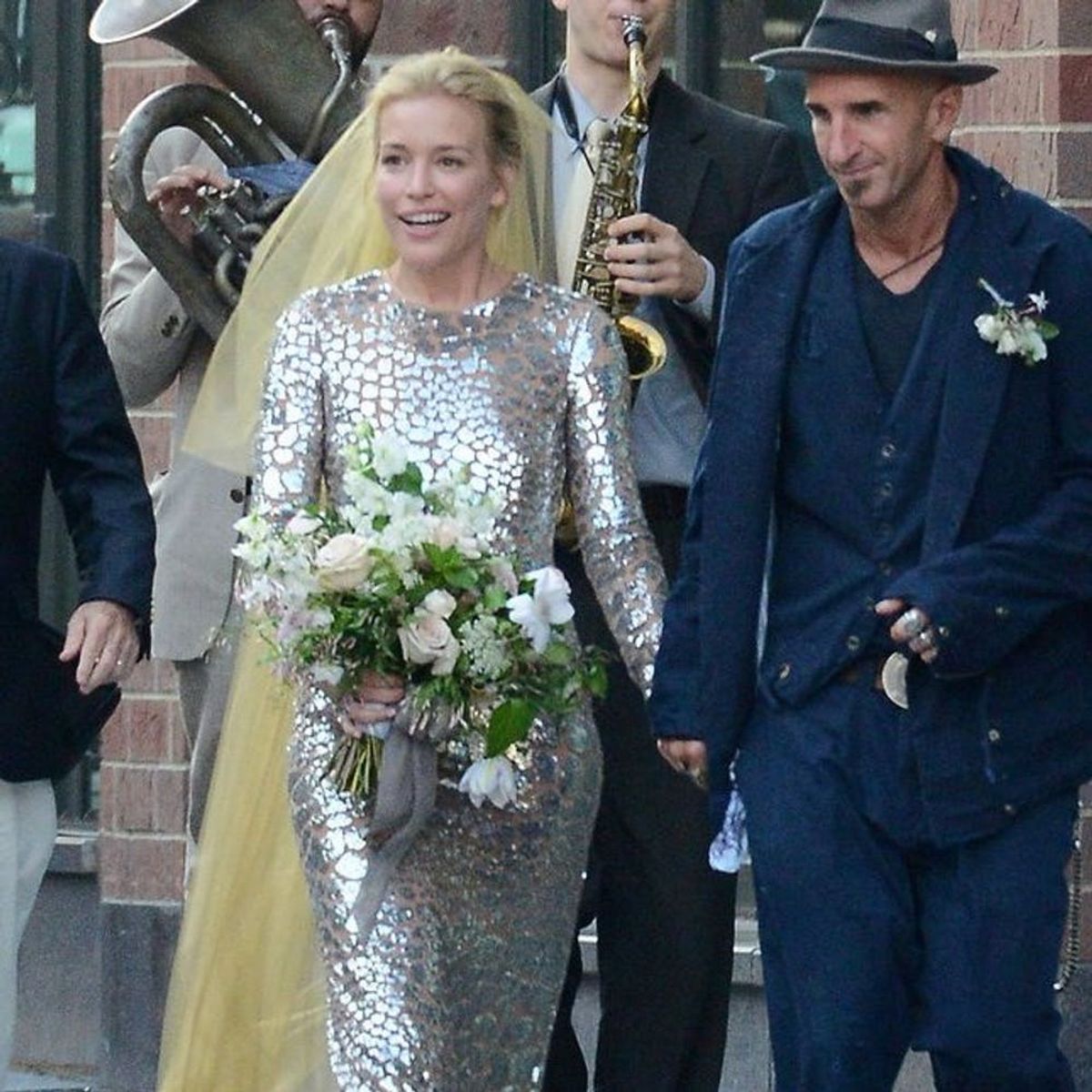 2. Piper Perabo: One bride not content with a white wedding dress? Piper Perabo. The actress opted to wear a textured metallic gown and yellow veil when she tied the knot to producer Stephen Kay in July 2014. (Photo via FameFlynet/Popsugar)