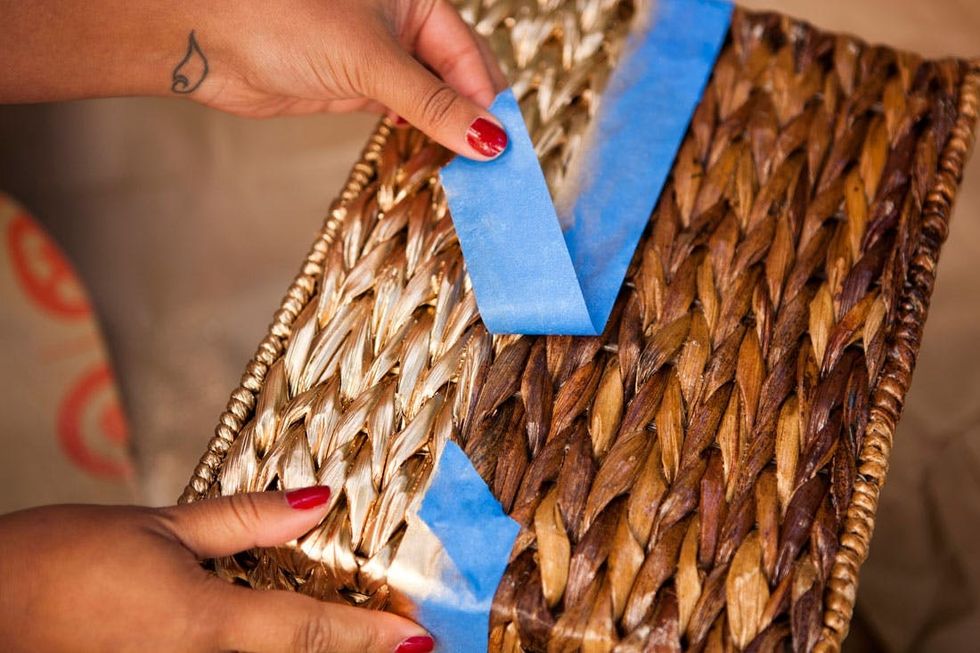 First, let’s get some gilded baskets up in here. Tape around the center of your basket. Spray paint the bottom half, creating a gold-dipped look. We sprayed the bottom as well to make the whole look complete.