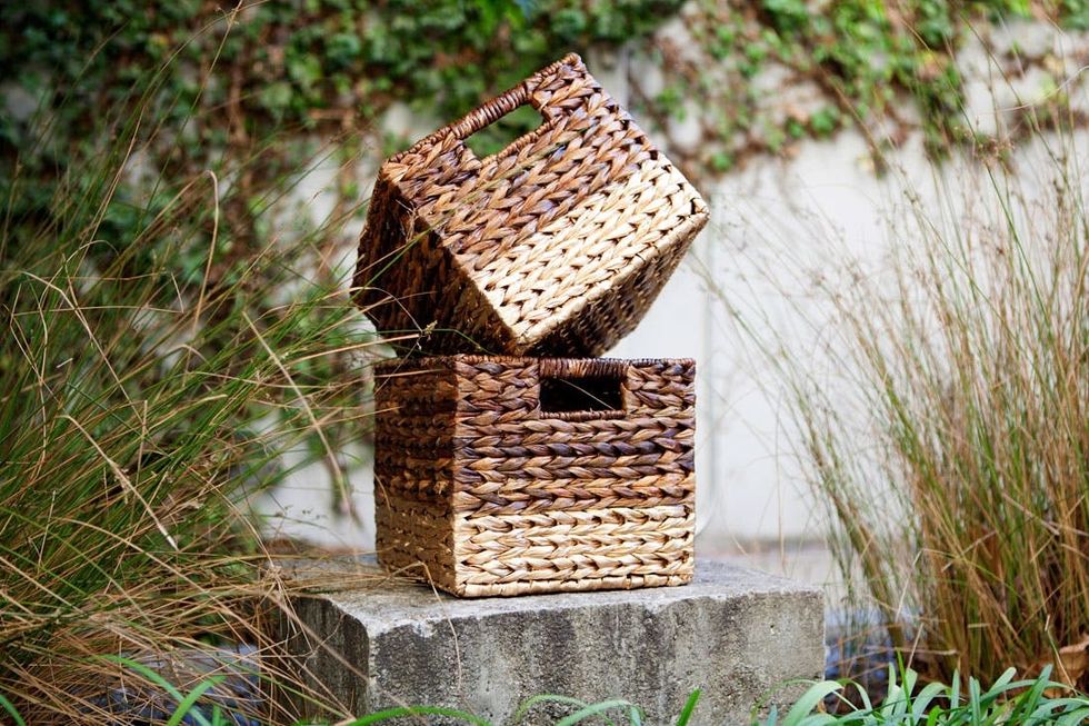 We started with some gorgeous basket-style storage bins we picked up at Target. Since baskets don’t hold water particularly well, we snuck four mason jars in each basket to hold the flowers. More on that in a moment!