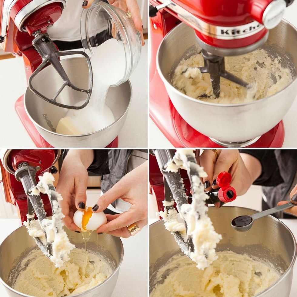 1. Preheat oven to 350 degrees F. Cream the butter and sugar, until light and fluffy. Add eggs and vanilla and mix to combine.
