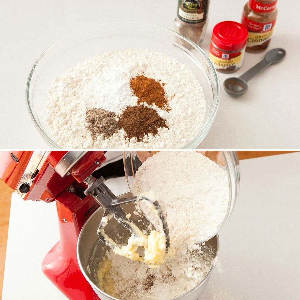 2. Combine flour, baking powder, cinnamon, cardamom, and allspice. Put mixer on low speed, gradually add flour, and beat until mixture pulls away from the side of the bowl.