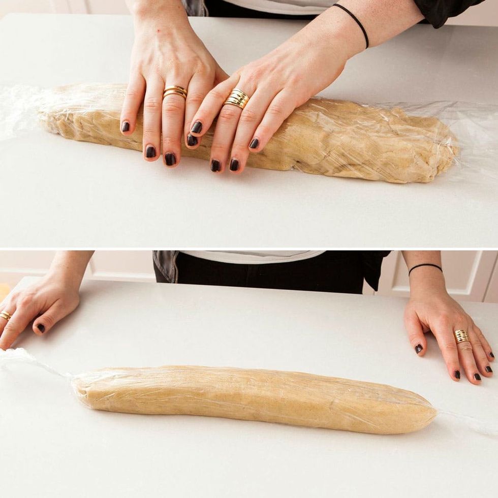 3. Form the dough into a log and wrap in plastic wrap. Chill for 30-45 minutes.