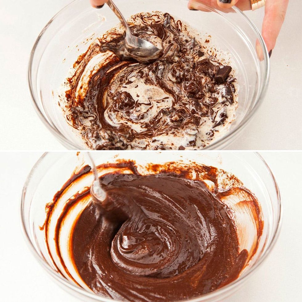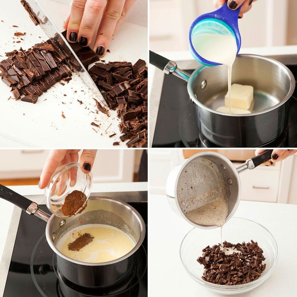 2. Pour the cream mixture over the chopped chocolate. Let sit for 60 seconds.