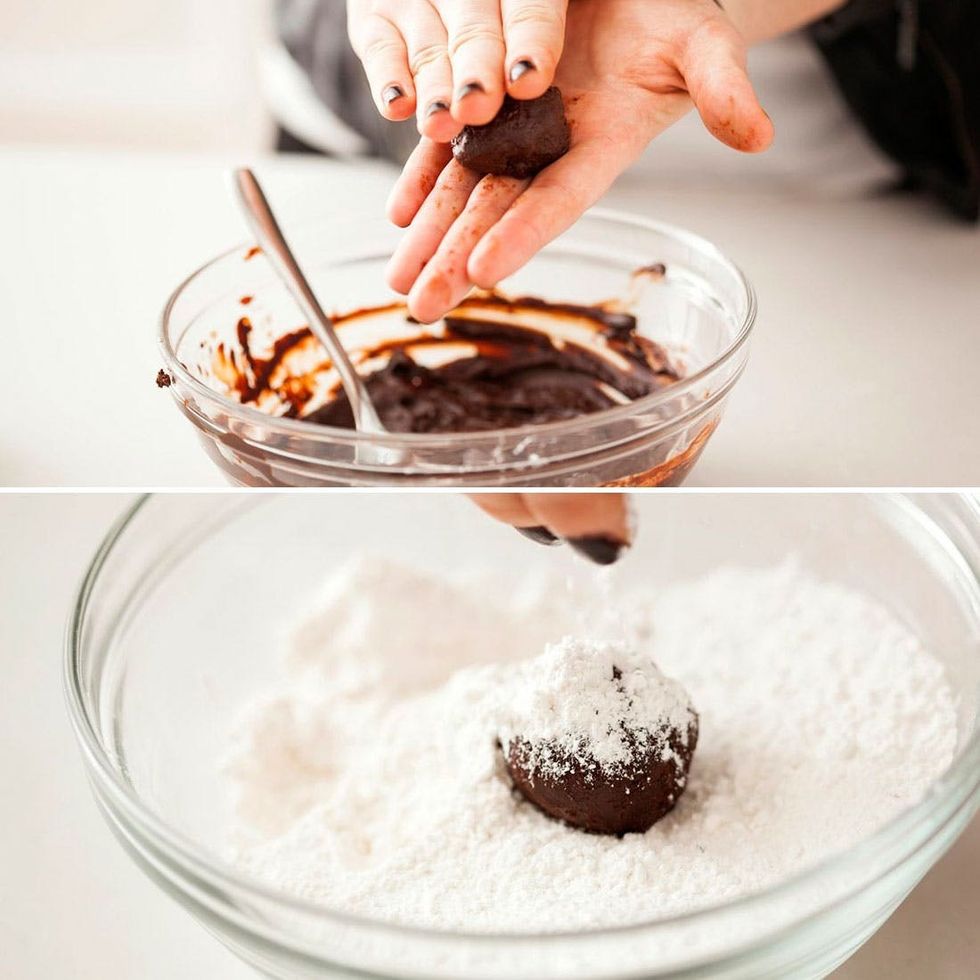 Scoop the chocolate into balls, roll in your hands, and toss in powdered sugar.