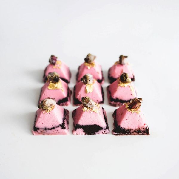 2. Champagne + White Rose Chocolate Pyramids: If their beautiful aesthetic hasn’t won you over just yet, these stunning pyramid treats contain even more whimsical and romantic-sounding ingredients. Your guests will never believe you, but these pretty little pyramids are *super* easy to make, using Champagne, white chocolate, crystallized rose petals and edible gold leaf. (via Butter & Brioche)