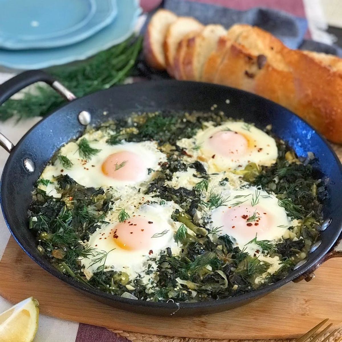 Green Shakshuka: Our favorite thing about this recipe is that it's flexible. Use a combination of whichever greens are in-season and affordable at the store, then top with eggs for protein.